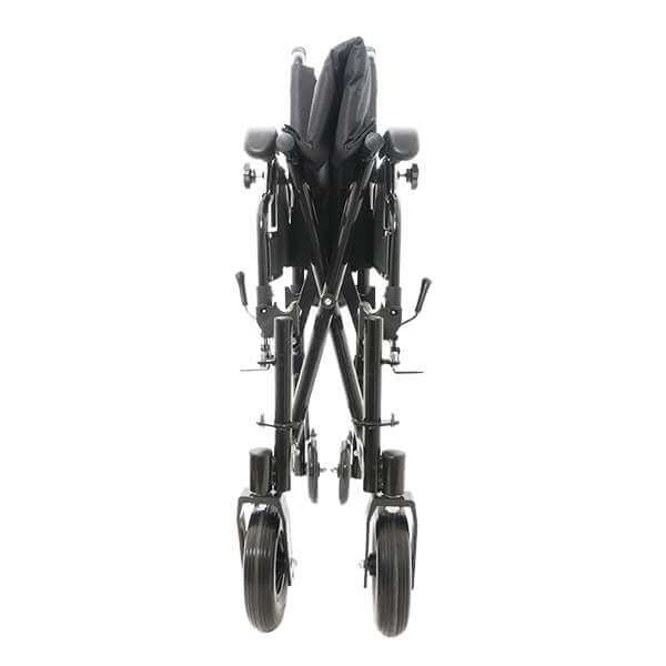 - Складная алюминиевая коляска с фиксированной спинкой, откидными подлокотниками и подножками.